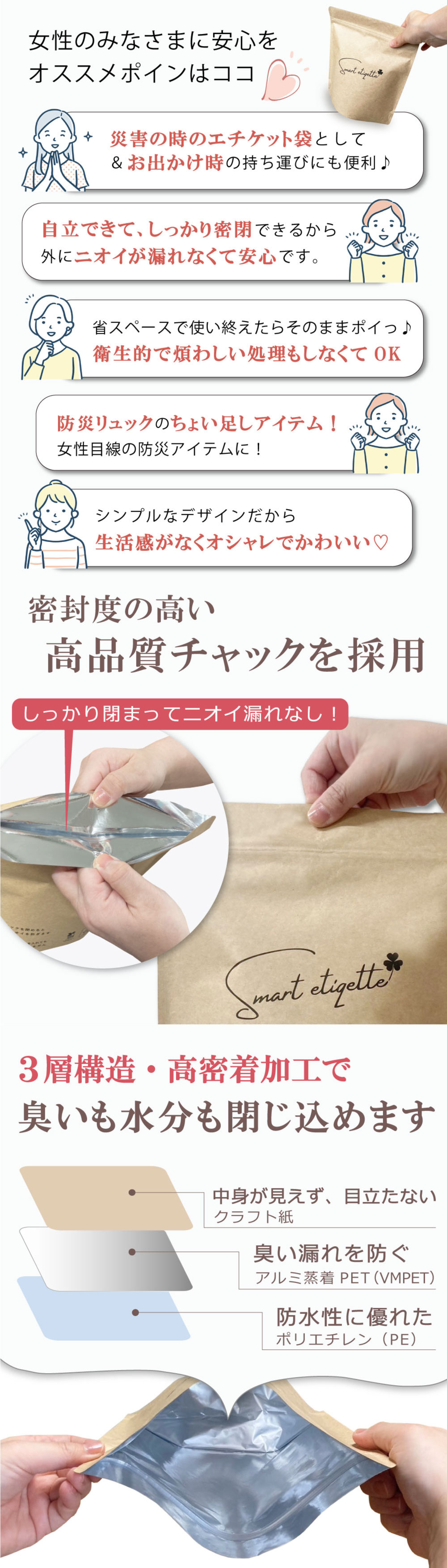 トップ > ドラッグビューティ > <メール便>防災 非常用 使い捨て 日本製 サニタリーバッグ サニタリーボックス [スマートエチケット] smart etiqette 防水 強力防臭袋 生理用品 汚物袋 オムツ 女性用災害衛生袋 旅行 外泊 お泊り 入院 防臭 消臭袋 エチケット 袋 チャック付 送料無料