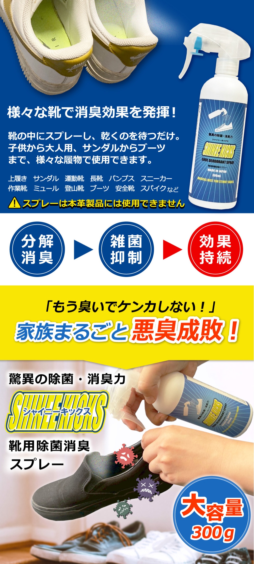 トップ > シューケアグッズ シャイニーキックスシリーズ > \直販限定!送料無料/ 靴 消臭 パウダー 除菌 消臭 スプレー☆24時間ニオイブロック☆ [シャイニーキックス 消臭スプレー+パウダーセット] 靴消臭スプレー 大容量300ml 天然成分 サッカースパイク 消臭 抗菌 ニオイ 靴の臭い 足臭 国内正規品 日本製 蒸れ ブーツ スニーカー ギフト バスケットシューズ 消臭 パウダー 80g