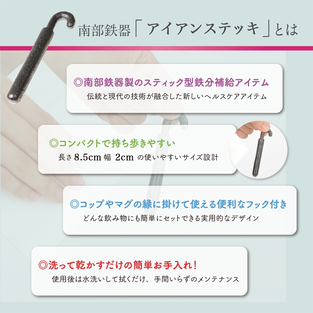 「アイアンステッキ」は、古くから愛される南部鉄器の丈夫さと、日々の暮らしを守る「鉄の傘」という願いを込めて名付けられました。重くて場所をとる従来の鉄瓶や鉄玉子とは違い、スタイリッシュなスティック型に。 こだわりのカーブした持ち手部分がポイント!コップやマグカップ、さらにはペットボトルのフチにちょこんと引っ掛けて使えるので、使い勝手は抜群です。 長さ85mm、幅幅 20mmとコンパクトなので、個人的に使うのにぴったり。目立たず、持ち運び もラクラク。キッチンやオフィスのデスクにもすんなり馴染みます。このスティック型でフック付きのデ ザインが、「使いやすさ」と「持ち運びやすさ」という大きな魅力を生み出しています。