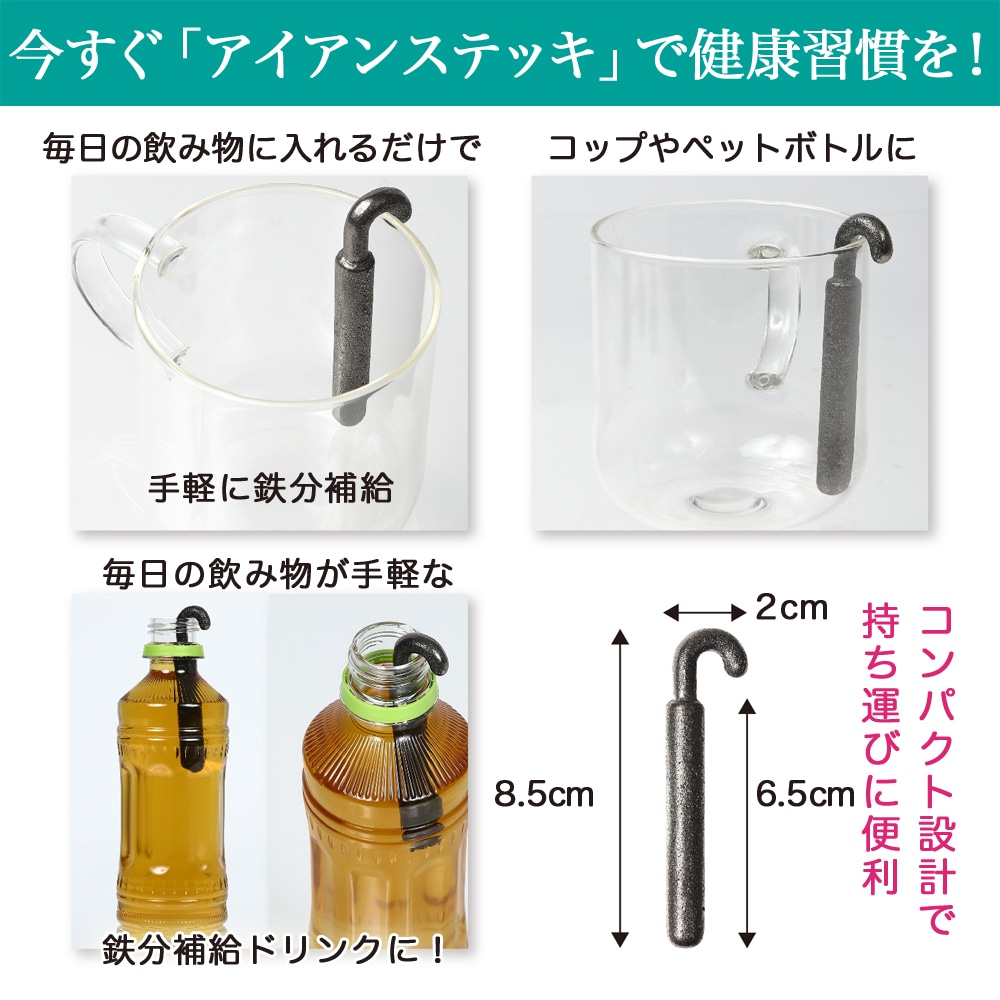 お家でも、オフィスでも、旅行中でも。「アイアンステッキ」は、どんなあなたの日常にもスッと馴染みます。スティック型でフック付きだから、お気に入りのマグカップや水筒に入れて使うのがおすすめ。一 口飲むたびに、大切な鉄分をしっかりチャージできます。 特に緑茶と一緒に使うと、鉄分がたっぷり溶け出すように作られていますが、もちろん水(温かい水 でも冷たい水でも)や、麦茶、ルイボスティーなど、どんな飲み物に入れても効果は変わりません。あなたの好きな飲み物で続けられるから、毎日の水分補給が、そのまま鉄分補給の時間になります。 この手軽さこそが、「アイアンステッキ」の大きな魅力。健康を意識しているすべての方に、ぜひ使っていただきたいアイテムです。
