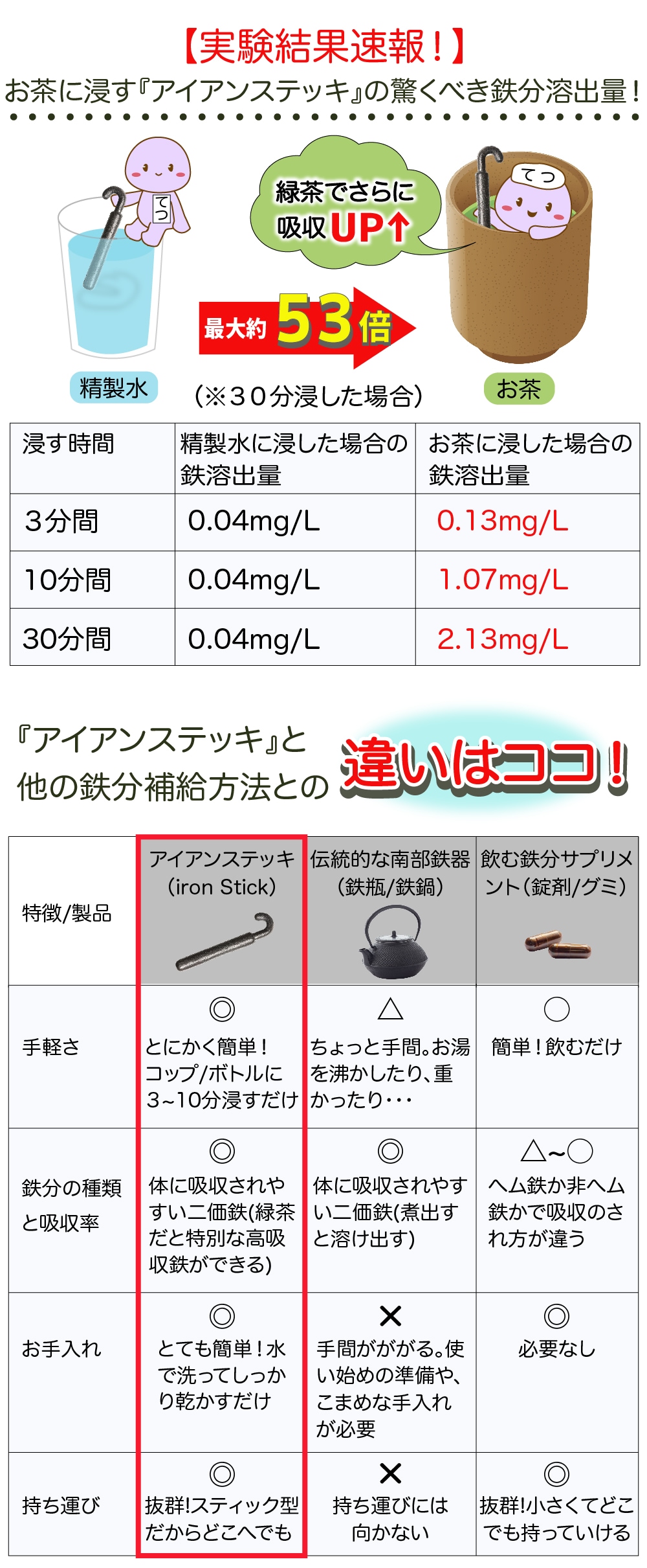 同じ時間でも、お茶に浸すことで、精製水に比べて最大で約53倍(30分浸し た場合)もの鉄分が溶け出すことが分かっています。これは、ただ鉄分がたくさん溶け出すだけでなく、緑茶との特別な相乗効果で、とても吸収されやすい鉄分が生まれることを意味します。 この発見は、「アイアンステッキ」が単なる鉄分補給アイテムではなく、緑茶を飲む習慣がある方には 特に効果的な、まさに画期的な解決策であることを示しています。これまで鉄分補給を諦めていた方も、ぜひ「アイアンステッキ」でその違いを実感してください!