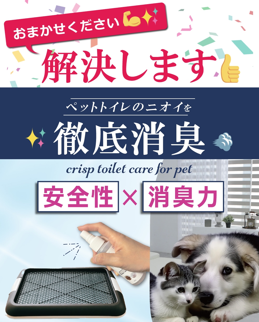 「クリスプトイレケア」は、ペットのトイレや、トイレ周りのニオイを強力消臭・除菌するお掃除用スプレーです。