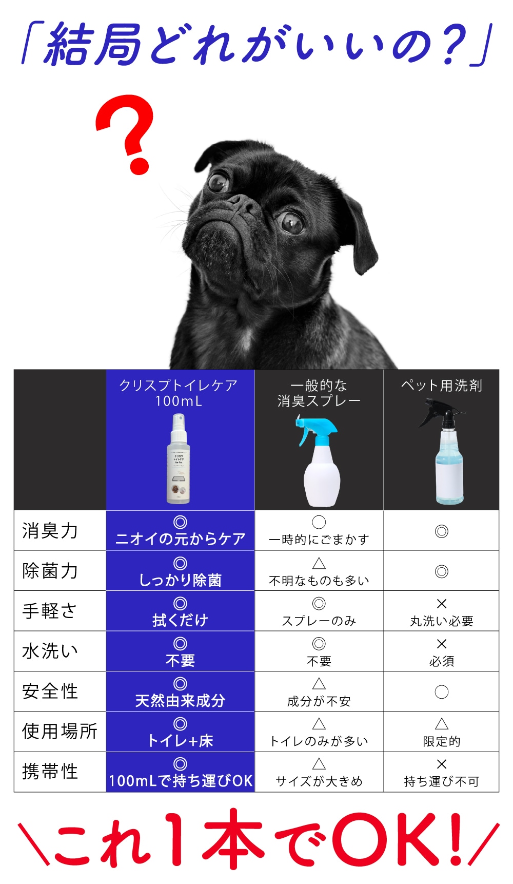\最安値/ペット トイレ 消臭スプレー [クリスプトイレケア 100/300ml] 選べる2サイズ ペットトイレ 消臭スプレー 犬 猫 尿臭対策 拭くだけ簡単 アンモニア臭 強力消臭 除菌 ホタテ貝殻 焼成カルシウム 天然由来 ペット用 犬 トイレ 尿臭 消臭 猫砂 消臭スプレー ケージ サンプル 100ml 大容量 300ml 除菌 国内正規 日本製